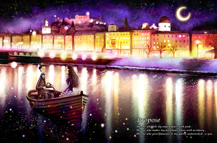 엘리얌님 - 저도 이렇게 프로포즈를... 상상속에서 하고 있답니다. 글고 신기하게도 이 글을 올린후 새벽녁에 잠시 잠이 들었었는데... 그림속의 상황으로 들어가 있더라구요.(완전 신기했답니다!!) 그런데 배를타고 가는 상황이 아니라... 저~멀리 건물있는 곳에서 강을 보며 거닐더라는...ㅎㅎㅎ(그럼... 난 주인공은 아닌건가...- _ -;;)